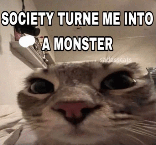 Descripción del contenido: a cat with a caption that says society turne me into a monster