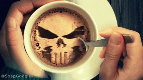 a person is holding a cup of coffee with a punisher skull drawn on it