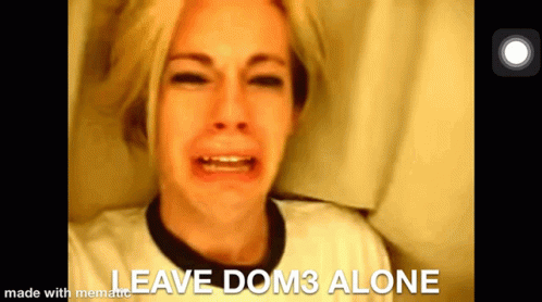 a video of a woman crying with the words " leave dom3 alone " on the bottom