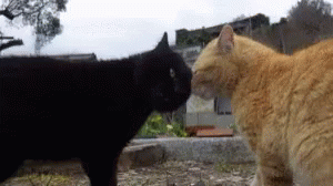 Descripción del contenido: a black cat and an orange cat standing next to each other