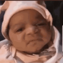 a close up of a baby wearing a pink hat and making a funny face .