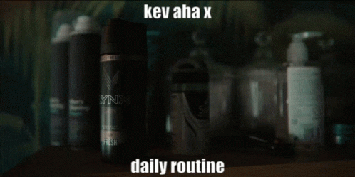 Descripción del contenido: a man standing in front of a mirror with the words kev aha x daily routine on the bottom