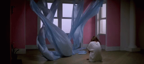 Descripción del contenido: a woman in a white dress sits on the floor in front of a window with blue curtains hanging from it