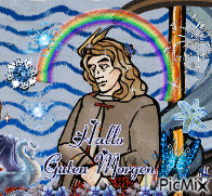 a picture of a man with a rainbow and the words hallo guten morgen on it
