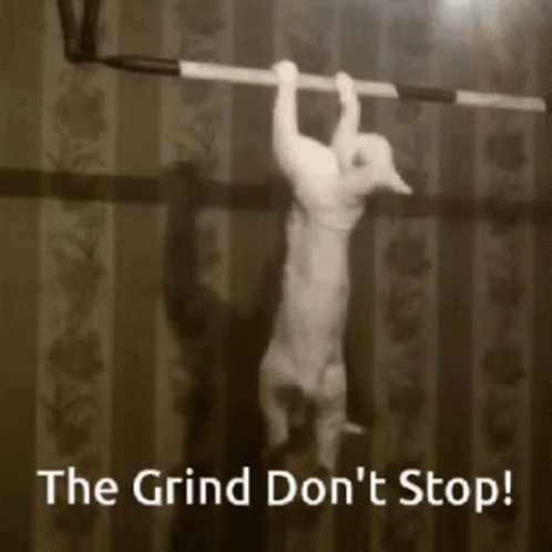 Descripción del contenido: a cat hangs upside down on a bar with the words " the grind don 't stop " written below it