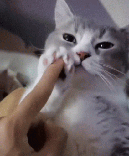 Descripción del contenido: a person is petting a gray and white cat 's paw .