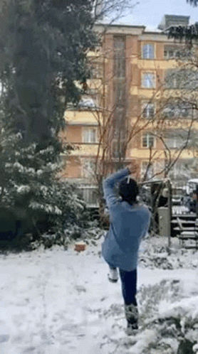 Descripción del contenido: a woman is standing in the snow in front of a building and trees .
