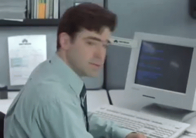 - Descripción del contenido: a man sits at a desk in front of a computer with a sticker on the wall that says ' microsoft '