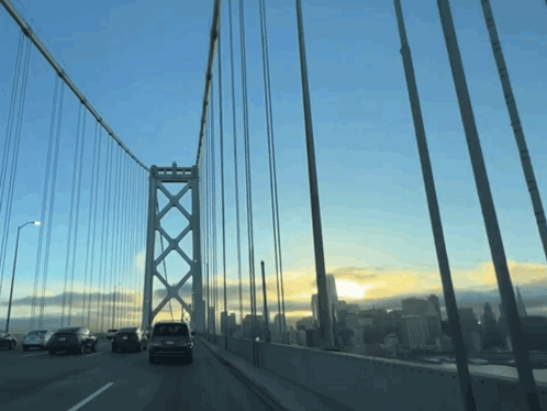 a few cars are driving on a bridge with the sun setting in the background