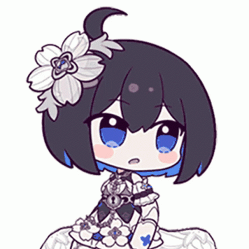 - Descripción del contenido: a cartoon girl with black hair and blue eyes is wearing a white dress with a flower in her hair .