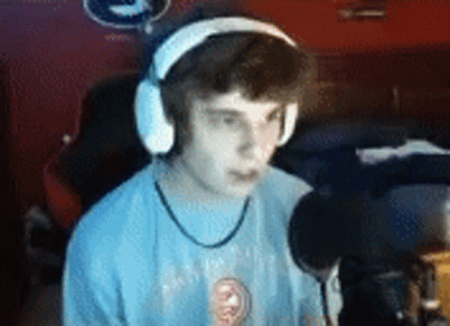 Descripción del contenido: a man wearing headphones and a blue shirt is sitting in front of a microphone .