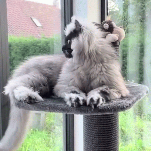 Descripción del contenido: a cat is laying on a scratching post with a stuffed animal on its head .