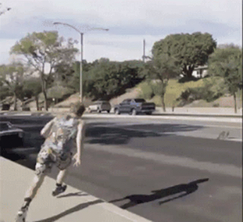 Descripción del contenido: a person is running down a street with a blue truck behind them