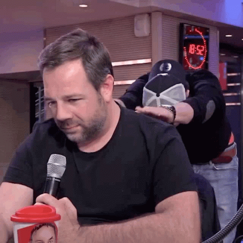 Descripción del contenido: a man sitting at a table with a microphone and a clock that says 10:52