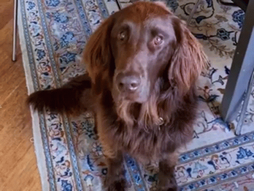 Descripción del contenido: a brown dog is sitting on a rug looking up at the camera