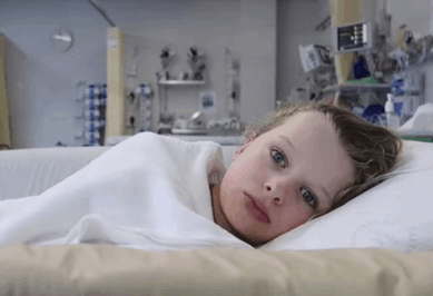 Descripción del contenido: a young boy is laying in a hospital bed with a white blanket on him