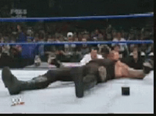 Eduki-azalpena: a wrestler is laying on the ground in a wrestling ring while a crowd watches