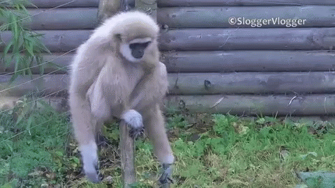 Eduki-azalpena: a gibbon is standing on its hind legs on a wooden post in the grass .