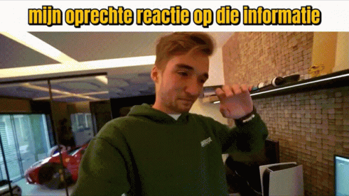 a man in a green hoodie is standing in front of a wall with the words " mijn oprechte reactie op die informatie " on it