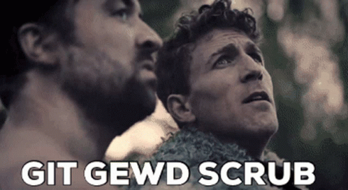 a shirtless man is carrying a large log and the words get good scrub are below him