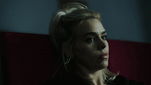 a woman with blonde hair is wearing a black shirt and red lipstick