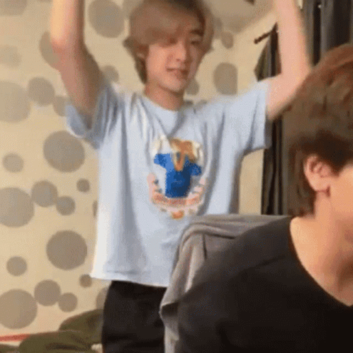 a man wearing a blue shirt with a teddy bear on it is dancing in a room .