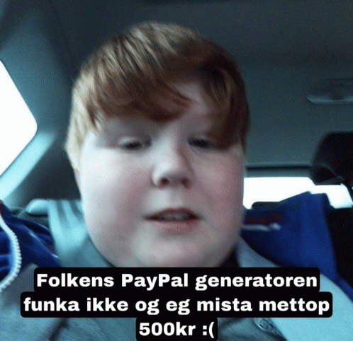 a boy in a car with a caption that says folkens paypal generatoren funka ikke og eg mista metop 500kr