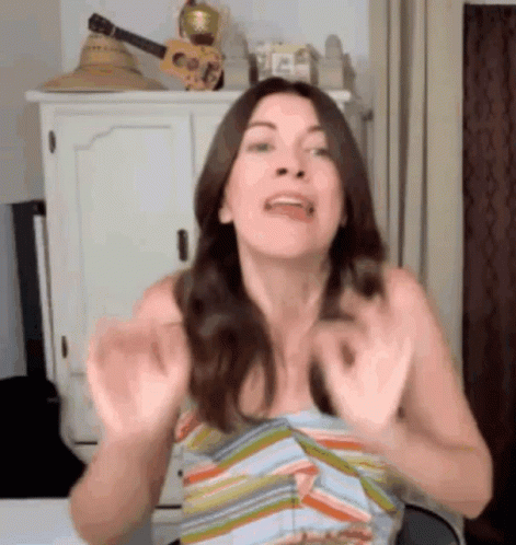 a woman in a striped shirt is making a funny face while sitting in front of a dresser .
