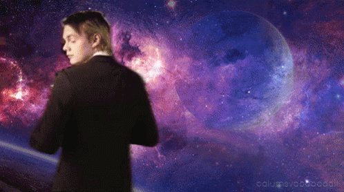 - Paglalarawan ng Content: a man in a suit is standing in front of a galaxy and a planet with the words collapsvoodoo on the bottom right