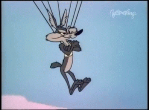 Paglalarawan ng Content: a coyote is flying through the air with a parachute and the word boomerang is on the bottom