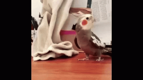 Paglalarawan ng Content: a small bird is standing on a wooden table next to a piece of cloth .