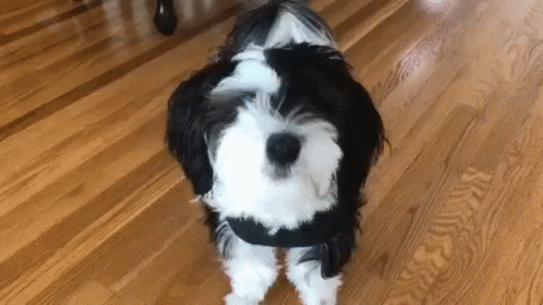 Paglalarawan ng Content: a black and white dog wearing a baseball cap is standing on a wooden floor .