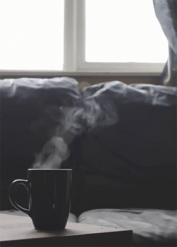 Paglalarawan ng Content: a cup of coffee with steam coming out of it sits on a table in front of a window