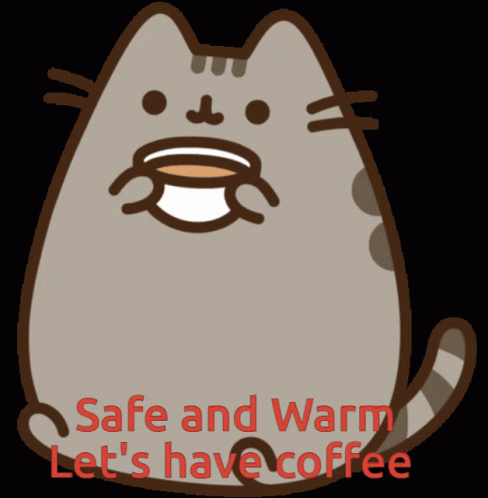 Paglalarawan ng Content: a cat with a cup of coffee in its mouth and the words safe and warm let 's have coffee below it