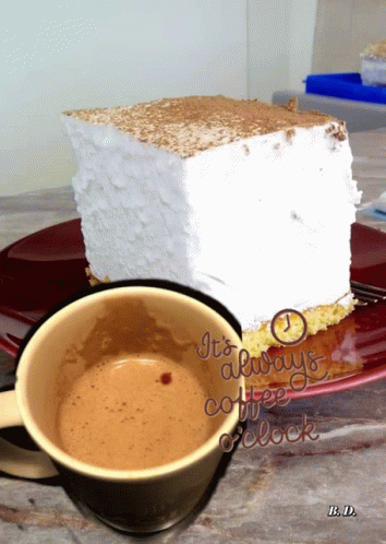 Paglalarawan ng Content: a cup of coffee and a piece of cake on a plate with the words it 's always coffee clock