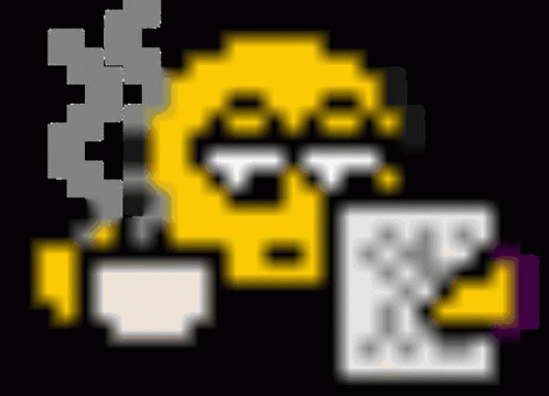 Paglalarawan ng Content: a pixel art of a smiley face holding a cup of coffee and a piece of paper
