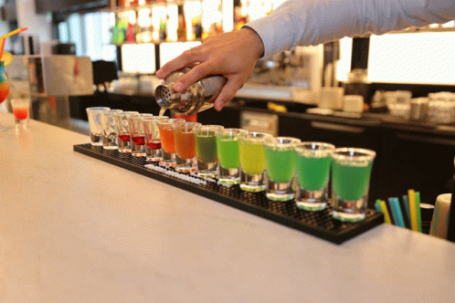 Paglalarawan ng Content: a bartender pours a drink into shot glasses
