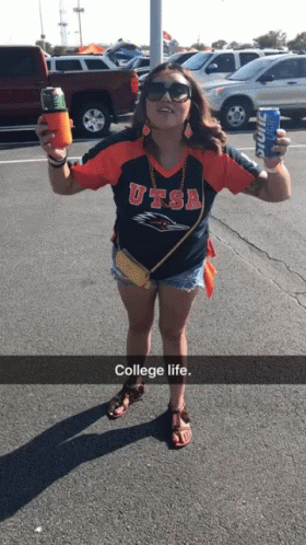 Paglalarawan ng Content: a woman wearing a utsa shirt holds up two cans of beer