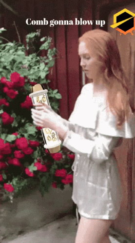 Paglalarawan ng Content: a woman in a white dress is holding a bottle with the words comb gonna blow up above her