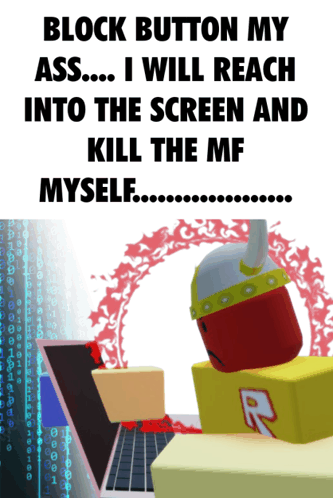 Paglalarawan ng Content: a poster that says " block button my ass ... i will reach into the screen and kill the mf myself ... "