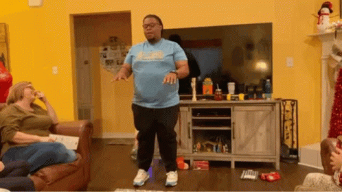 Paglalarawan ng Content: a man in a blue shirt is standing in a living room with a woman sitting on a couch .