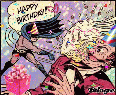 Paglalarawan ng Content: a cartoon of batman fighting a man with a cake that says happy birthday on it