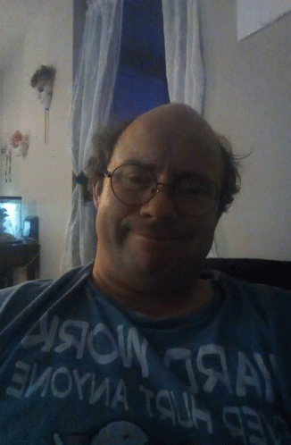Paglalarawan ng Content: a man wearing glasses and a blue shirt that says enjoy
