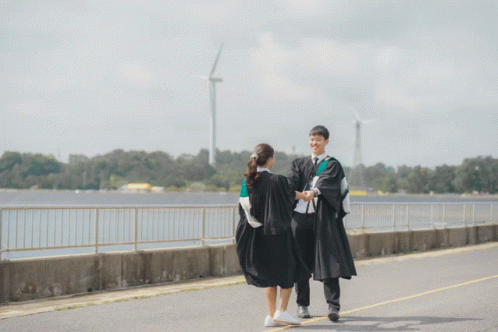 Paglalarawan ng Content: a man and a woman in graduation gowns are walking down a road with a windmill in the background