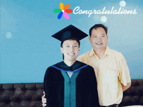 Paglalarawan ng Content: a man in a graduation cap and gown stands next to another man with congratulations written on the bottom