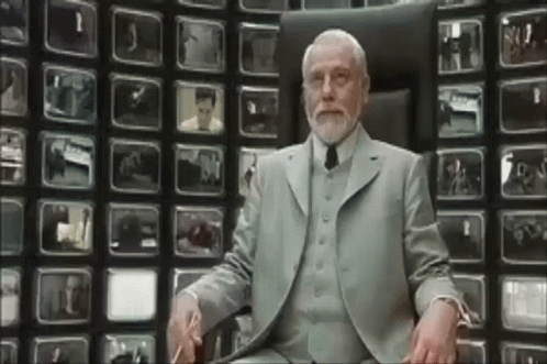 Paglalarawan ng Content: a man in a suit and tie is sitting in front of a wall of televisions
