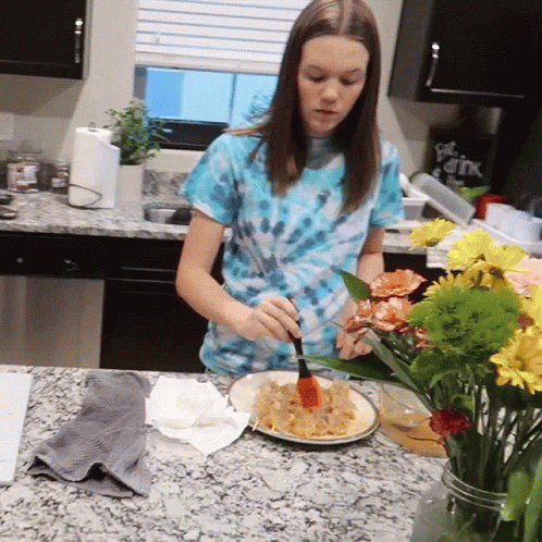 Paglalarawan ng Content: a woman in a blue tie dye shirt is preparing food