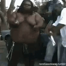 Paglalarawan ng Content: a very fat man with a beard is dancing in a crowd .
