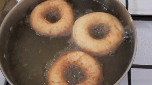 Paglalarawan ng Content: three doughnuts are being cooked in a pot of boiling water on a stove .