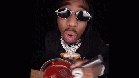 Paglalarawan ng Content: a man wearing sunglasses and a bandana is holding a bag of money in his hand .